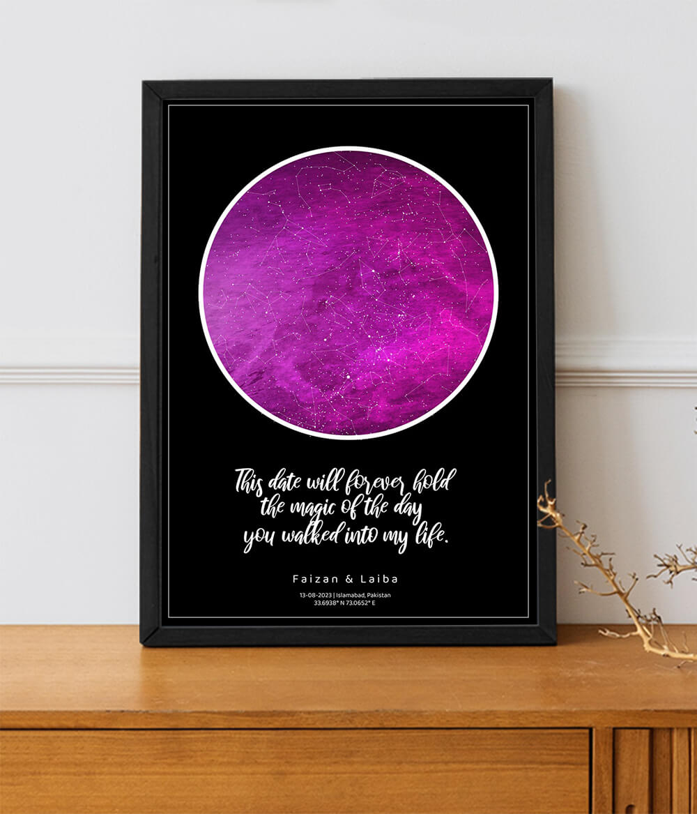 Step into a realm of enchantment as we present the Mulberry Star Map Poster, a captivating tribute to the cherished moments that have woven the tapestry of your life. Crafted with meticulous precision and artistic finesse, these extraordinary Star Map Frames encapsulate the celestial arrangement of stars, planets, and constellations at a precise date, time, and location of your choosing. Whether it's a birthday celebration, a meaningful engagement, a union of hearts in matrimony, or any other extraordinary event, our custom map posters offer a timeless portal to relive the magic of those defining moments, forever etched in the luminous embrace of the cosmos.